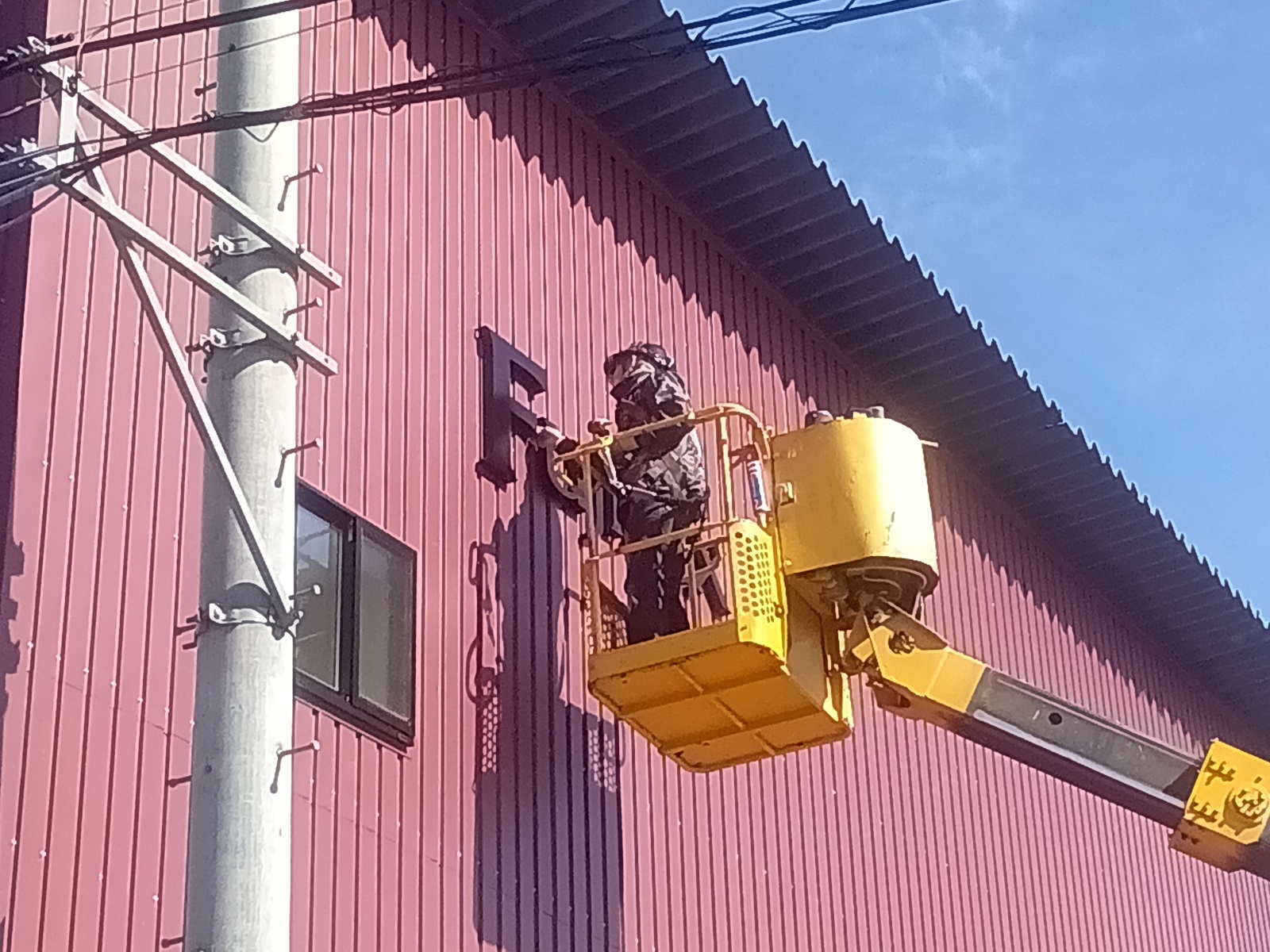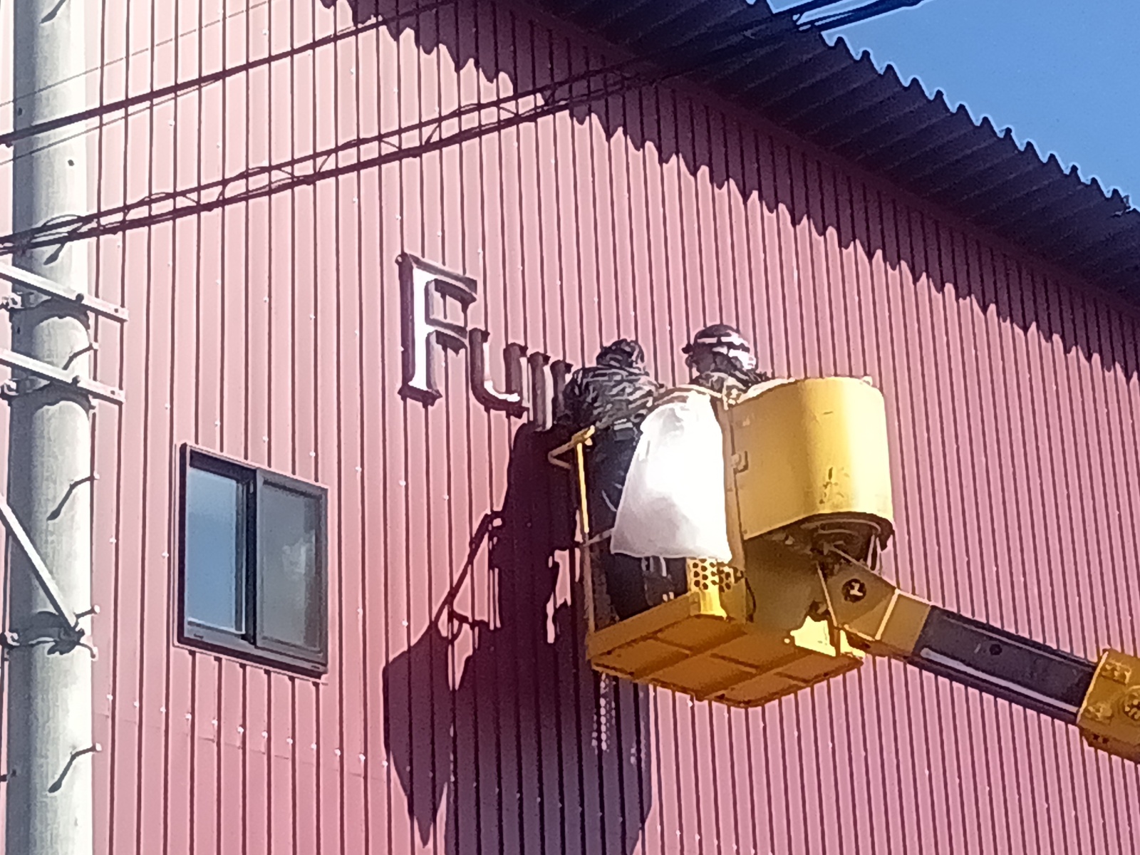 本社看板 2026年2月13日 最終更新日時 : 2026年2月13日 fujicreate 今日は本社の広告塔と玉村倉庫の看板の施工をしました。広告塔にはQRコードを追加で貼り、玉村倉庫の壁面に社名のステンレス箱文字を取付けました。高所のためフルハーネスを装着しました。安全第一です!